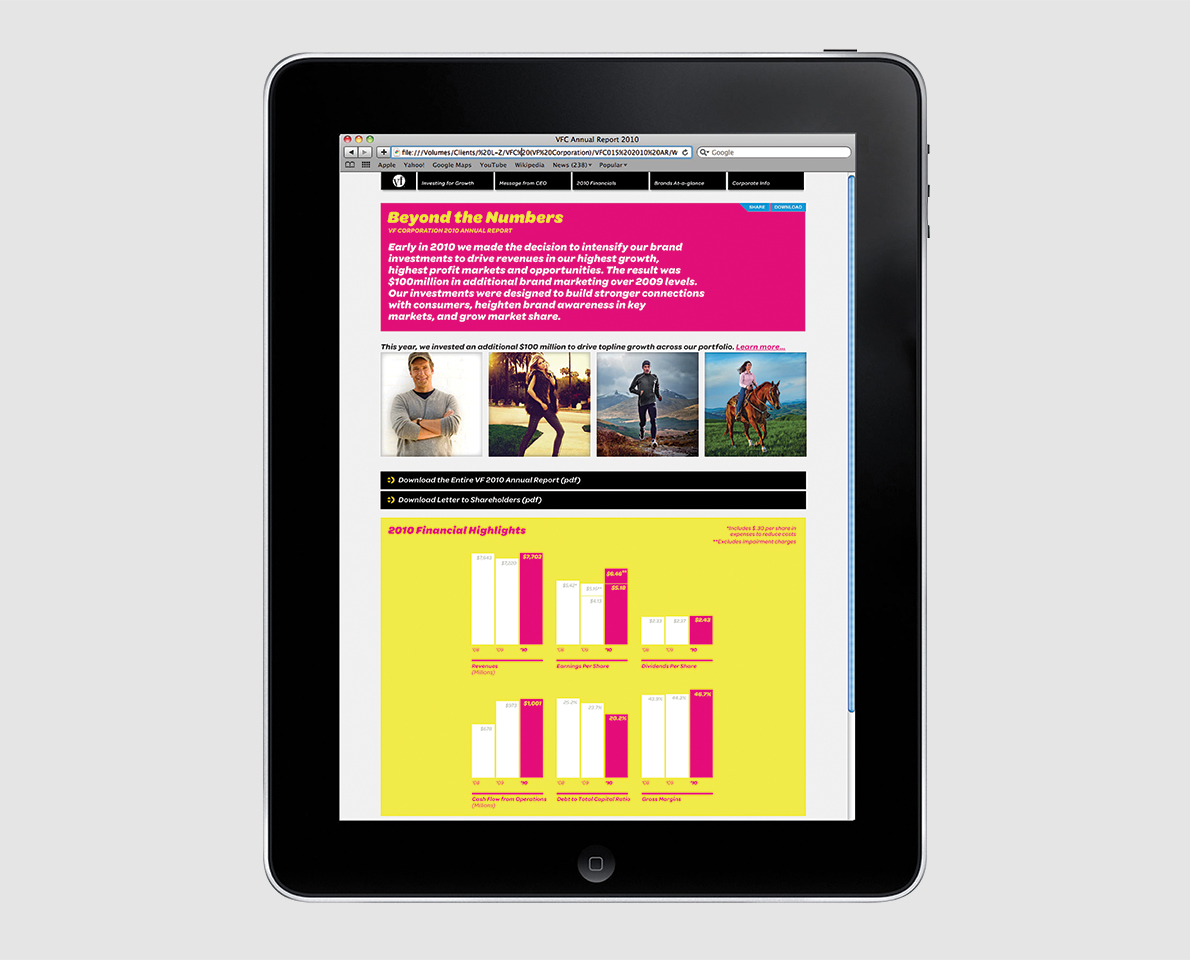 As investors get real-time information online, we’ve helped evolve VF’s annual report so that it serves a broader purpose. It’s how VF Corporation communicates its strategy and goals to the investor community, employees, potential hires, government agencies, acquisition targets, and partners.